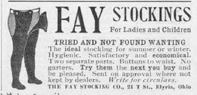 These stockings were made by the Fay Stocking company of Elyria, Ohio (south of Lake Erie in Loraine county). We know nothing about the company at this time. Attempts to discover anything about the Fay Stocking Company have been unsuccessful, and this is the only ad for Fay stockings that I have encountered in our research.