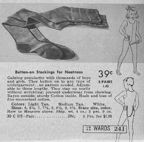 We thought that when we found a Wards advertisement for button-on long stockings in 1939 that it was a totally new (and largely unsuccessful) invention. Sears also had a similar product, but the fad was very short-lived because they disappeared quickly from the catalogues of successive years. But we were wrong about the novelty. As this image shows, button-on stockings were being sold as early as 1901.