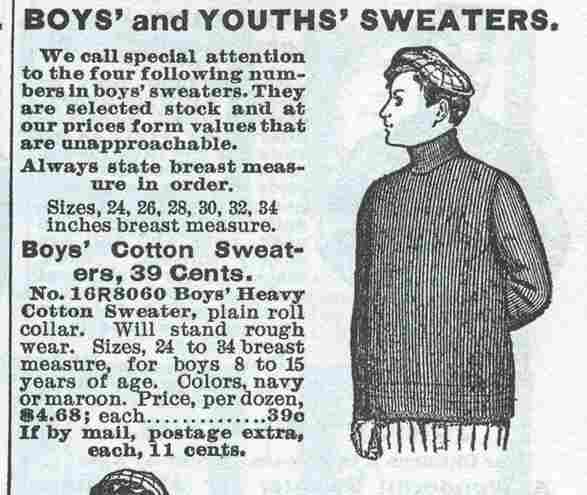 Here Sears use the term "roll-neck" rather than turtle neck sweater. The Sears ad copy read, "Boys' Roll Neck Sweaters. No. 16R8064 Boys' Strong, All Wool, Ribbed Sweater, with fancy ribbed rolled collar; elastic ribbed cuffs and tail; all wool; warranted to give good service. PLain colors, black, maroon, or navy. Sizes 24 to 34 breast measure. Price, each . . . 75 c.; Per dozen $9.00. If by mail, postage extra, each, 10 cents."