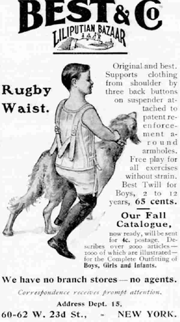 The Best ad copy read, "Best & Co. Liliputian Bazaar. Rugby Waist. Original and best. Supports clothing from shoulder by three back buttons on suspender attached to patent reenforcement around armholes. Free play for all exercises without strain. Best Twill for Boys, 2 to 12 years. 65 cents."