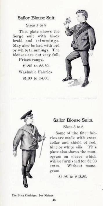 The sailor suit continued to be a popular style for boys during the 1900s, especially the early par oft the decade. We see the traditionally styling even more commonly than in the 1890s when we see more varied styles . Most were done as knee pants suits, although we see long pants suits as well. Knee pants were nearly universal for boys at the time. Sailor suits were the only outfits that boys might wear with lomg pants. The knee pants suirs were always picture as being worn with dark long stockings. The standard sailor suits with sailor blouses were commonly done in sizes 3-8 years. The dark navy blue suits were the most common, but we also see white suits for summer wear. We note a variety of sailor blouse outfits offered by the Utica Clothiers. two of which are illustrated. The company was based in DesMoines, Iowa who also had a catalog. The suits were offered in a wide range of fabric and colors.