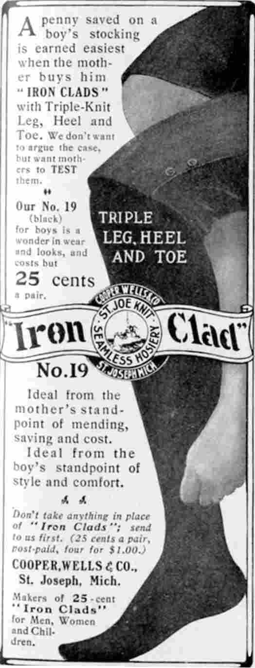 booklet, "What Iron Clads Mean to the Family Purse," illustrates a large assortment of Iron Clads for men, women, and children. It solves the stocking problem for the whole family. Sent free. Cooper Wells & Co., 300 Broad Street, St. Joseph, Mich."