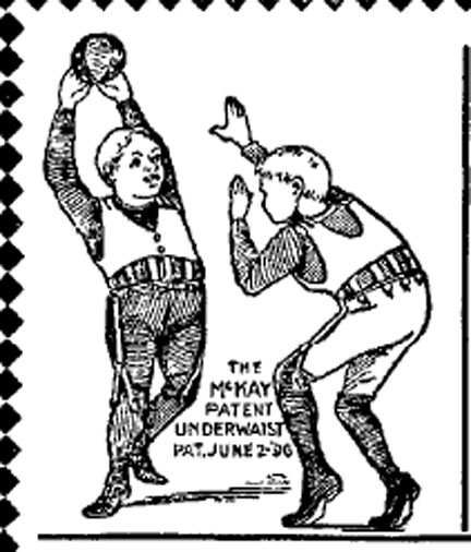 The paired images of waists--two different images in the same advertisement--appeared in 1904. One image shows the waist alone and another shows boys actually wearing the waist and playing ball to show how the waist held up their stckings. The boys are depicted in their underwear without their knee pants to show the McKay product. The boys are wearing long underwear in 1904,
