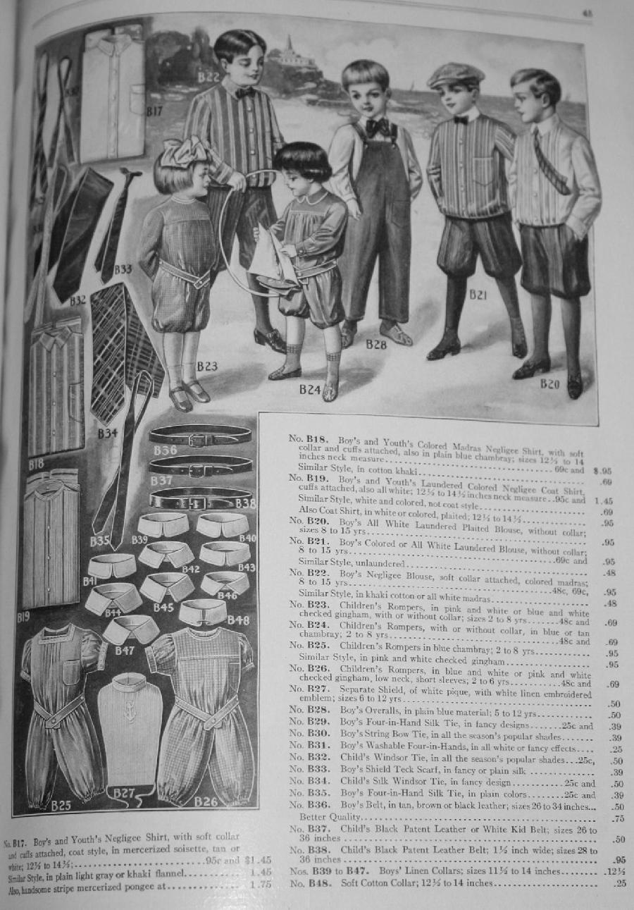Boys in 1910 wore a variety of shirt-like garments. We note primarily shirts, shirt-waists, and blouses. Blouses were still very common for boys, including younger teens. By blouses we mean shirt-like garments without tails that bloused at the waist using a drawstring. We also have a Ladies Home Journal illustration for younger boys' blouses. We do not have the ad copy, but believe the magazine is offering patterns for these blouses. Both detachable and attached collars were worn. Stern Brothers was an important retailer in the eraly-20th century. This 1910 page from the Stern Brothers' summer catalog show a range of garments and items, mostly for boys (figure 1). It primarily offers blouses, shirts, and collars, but a few other items such as rompers (for boys and girls) and overalls. The descriptions provide the age sizes. One term we do not understand is 'negligee' blouse and shirt. We are not sure how widely the term was used. A reader writes, "The negligee blouse refers to the material and was dressier (usually white and more delicate material) than other materials used in a blouse." We note what Stern Brothers' refers to a negligee blouse or shirt both with attached and detachable collars. Notice all the detachable collars which are unnamed. They attached to shirt waists and blouses to attach to blouses to size 14 1/2 which is easily a boy of 16 to 18 years old. At that time colors were not wash fast which means they were much more difficult to maintain and keep looking good so white was an easier color to keep fresh looking. Some colors were wash safe just not all. Stern alo mentions shirt coats. We are not sure just what thatbmeant, but it invoved the style and not the fabric. We note a wide range of collars, much more variety than modern collars. The two basic types were attached and detachable collars. There wre also different styles like Eton and Peter Pan collars, but many of the other collars do not seem to have had destinctive names.