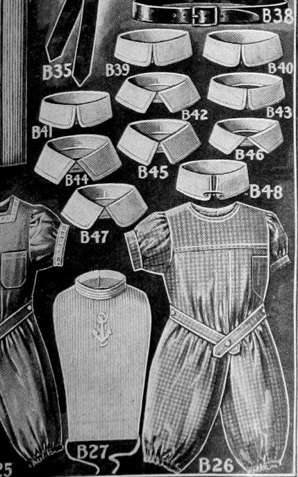 We note a wide range of collars, much more variety than modern collars. The two basic types were attached and detachable collars. There were also different styles like Eton and Peter Pan collars, but many of the other collars do not seem to have had destinctive names. Notice all the detachable collars which are unnamed.Fauntleroybcollars were still common in the 1900s, but had largely passed out of styl by the 1910s. Saiot collars were still worn, but not offered ion gthis page.