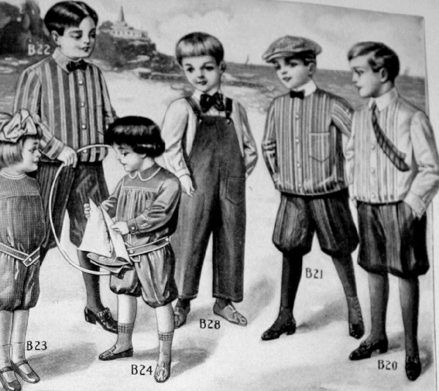 Boys in 1910 wore a variety of shirt-like garments. We note primarily shirts, shirt-waists, and blouses. Blouses were still very common for boys, including younger teens. By blouses we mean shirt-like garments without tails that bloused at the waist using a drawstring. Stern Brothers was an important retailer in the eraly-20th century. This 1910 page from the Stern Brothers' summer catalog show a range of garments and items, mostly for boys (figure 1). It primarily offers blouses, shirts, and collars, but a few other items such as rompers (for boys and girls) and overalls. The descriptions provide the age sizes. One term we do not understand is 'negligee' blouse and shirt. We are not sure how widely the term was used. A reader writes, "The negligee blouse refers to the material and was dressier (usually white and more delicate material) than other materials used in a blouse." We note what Stern Brothers' refers to a negligee blouse or shirt both with attached and detachable collars. Notice all the detachable collars which are unnamed. They attached to shirt waists and blouses to attach to blouses to size 14 1/2 which is easily a boy of 16 to 18 years old. At that time colors were not wash fast which means they were much more difficult to maintain and keep looking good so white was an easier color to keep fresh looking. Some colors were wash safe just not all. Stern alo mentions shirt coats. We are not sure just what that meant, but it invoved the style and not the fabric. We note a wide range of collars, much more variety than modern collars. The two basic types were attached and detachable collars. There wre also different styles like Eton and Peter Pan collars, but many of the other collars do not seem to have had destinctive names.