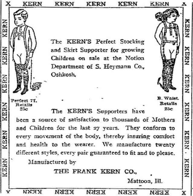 The ad copy read, "The KERN'S Perfect Stocking and Skirt Supporter for growing Children on sale at the Notion Department of S. Heymann Co., Oshkosh, [Wisconsin]. [illustration on the left: "Perfect 77 Retails 25 cents"; illustration on the right: "B Waist Retails 25 cents"]. The KERN'S Supporters have been a source of satisfaction to thousands of Mothers and Children for the last 27 years. They conform to every movement of the body, thereby insuring comfort and health to the wearer. We manufacture twenty different styles, ever pair guaranteed to fit and to please. Manufactured by The Frank Kern Co., Mattoon, Ill."