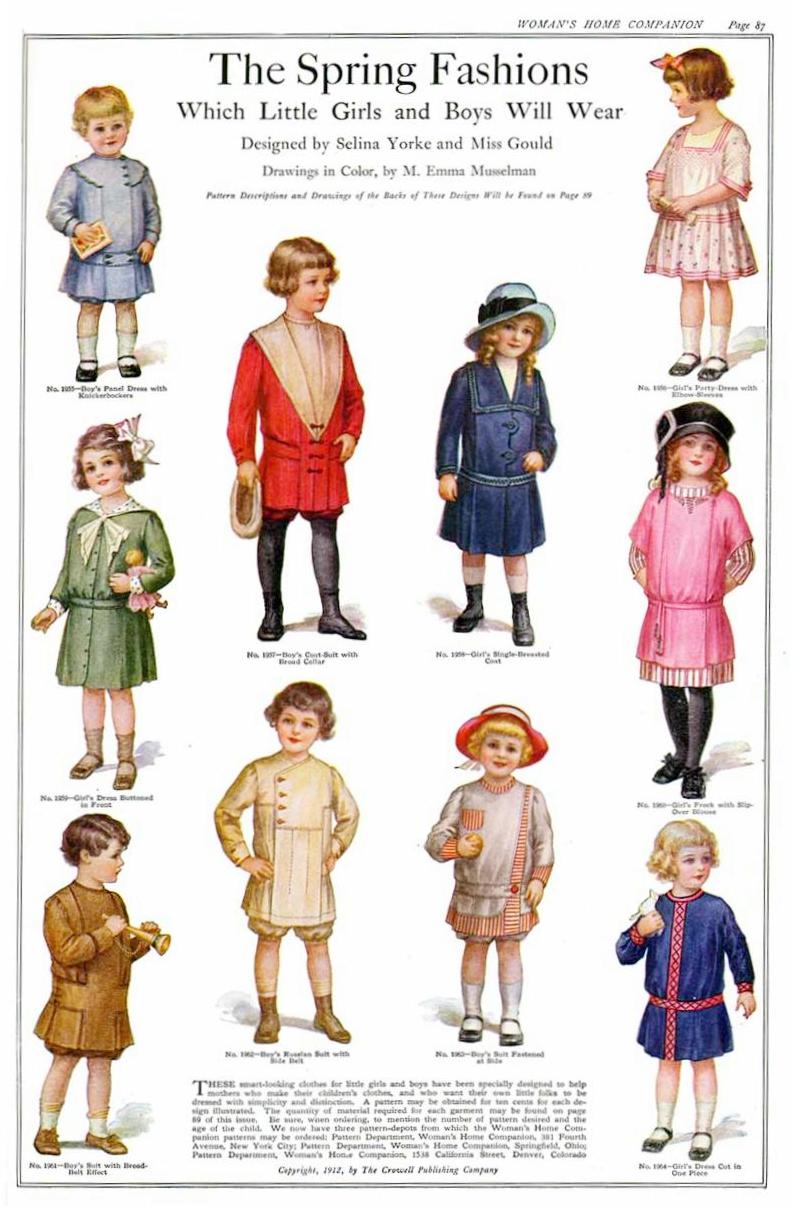 Woman's Home Companion (March 1912) provided color deawings of Spring fashions for boys and girl (figure 1). The magazine even employed people to design the fashions--Selina Yorke and a Miss Gould. There were tunics for the boys, including bright colors. Notice the bright red tunic in the center. And the fact the boy is shown wearing blong black st0ckings rather than white socks. This probably relects the fact that he is shown as a little older than the other boys and that this is a formal rather than a play outfit. The girls were pictured with dresses, some looking a bit like the boys' tunics. It is difficult to read the description of each item because od the small print. Th vterm tunic is not used. The younger boy's blue outfit is called a dress. The other boy's outdits are calkled suits. Notice all the different styles. Woman's Home Companion was one of the most important woman's magazines at the time, focusing on fashion and home making. This was not a manufacturer's or retailer's advertisemnt. The magazine provided patterns for the many home sewers. Many American mothers by the 1910s had a sewing machine. The drawings were by M. Emma Musselman. While the designers are unknown individuals, Musselmgan was an icon of fashion illustration. She produced some of the best drawings as a fashion illustrator during the early 20th century century. She worked with both children's and adult fashions, especially women's fashions. She profuced some bery striking images of women.