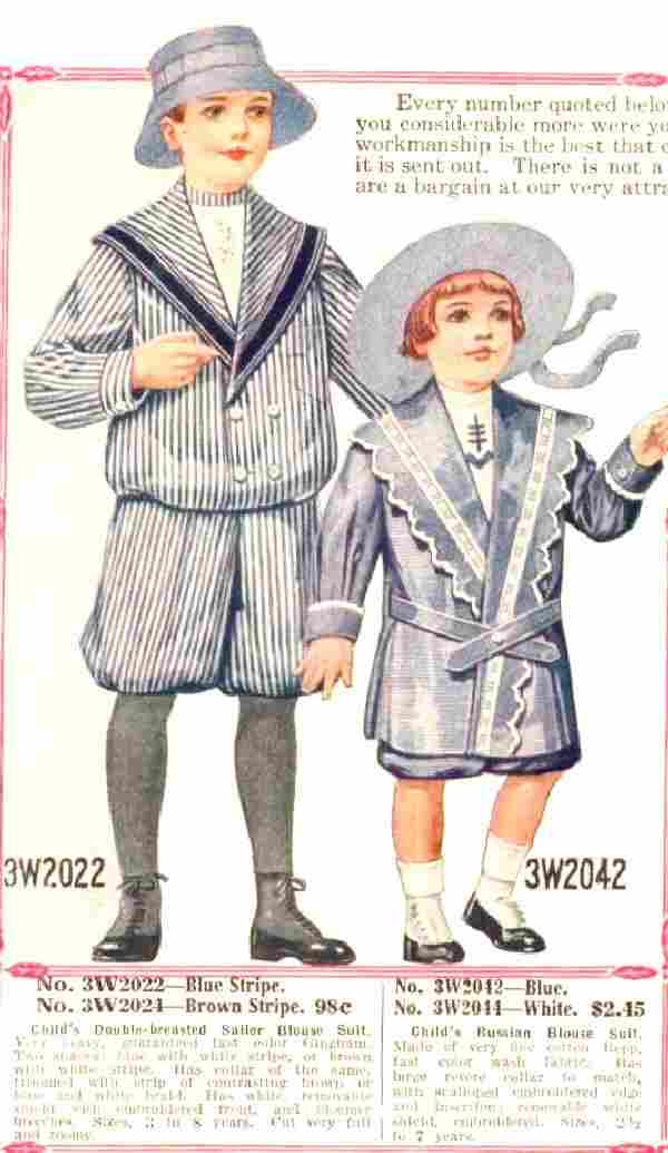 Wards in its Summer 1914 catalog offered several styles of wash suits. Mist were Russian blouse suits. There were also Sailor blouse suits and French blouse suits. Here are some of thise suits. The term suits are used because the top and bottom are of the same or cntrasting material.
