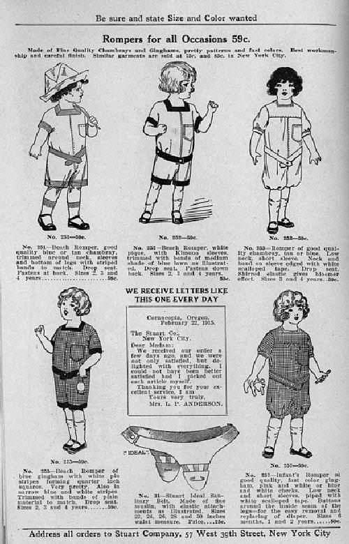 Stuart's reports that these rompers cost 59 cents and were "Made of Fine Quality Chambrays and Ginghams, pretty patterns and fast colors. Best workmanship and careful finish. Similar garments are sold at 75 cents and 85 cents in New York City."