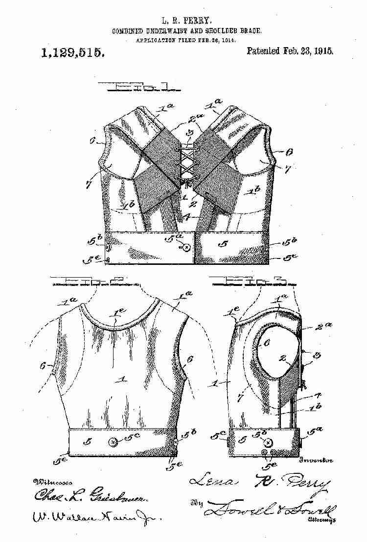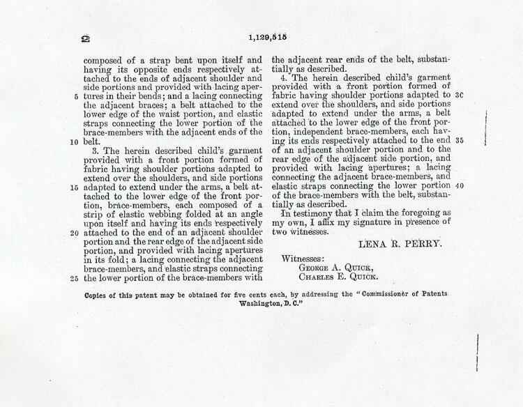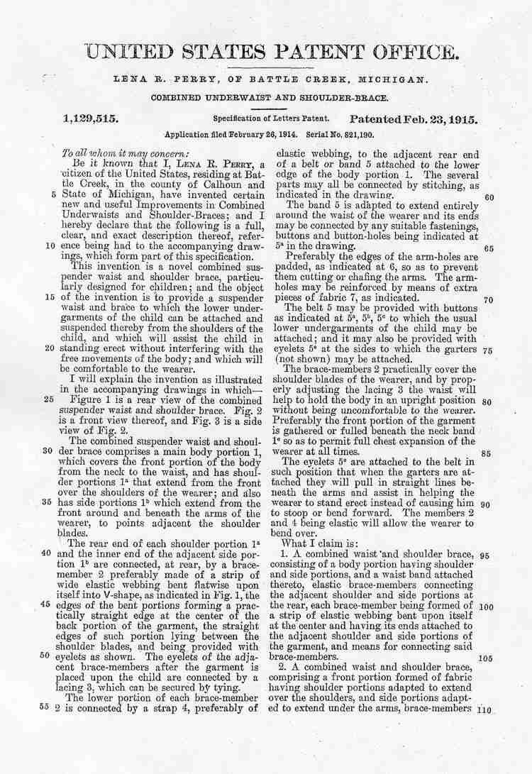 (both boys and girls). The applicant/inveter was Lena R. Perry. Women inventors were active in the garment trade. She calls it a "combined underwaist and shoulder brace". Although in the explanation she used the term suspender waist. Ms Perry explains, "This invention is a novel combined suspender waist and shoulder brace, particularly designed for children; and the object of the invention is to provide a suspender waist and brace to which the lower undergarments of the child can be attached and suspended thereby from the shoulders of the child, and which will assist the child in standing errect without interfering with the free movements of the body; and which will be comfortable for the wearer." The accompanying text provided details on the construction and features: page 1 and page 2 .