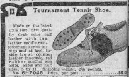 shoes in that it is an early athletic shoe with a "saddle reinforcement" across the top for support. I also note that it is quite expensive ($5.00) compared to the other shoes listed in the shoe section of the catalog. It is listed as a tennis shoe. I would conclude that at the time only more affluent buyers would have purchased these shoes. Tennis at the time was a country club sport and mostly played by the well to do. The earliest image of someone wearing saddle shoes that I have seen was a golfer in 1919 as I have reported earlier. Sizes 5-11