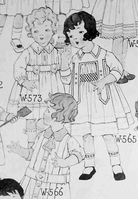 The model here suggests a girl to us, especially the treatment of the hair. We do note, however, a blue/pink option. The ad copy provides no indication about gender appropriatness. The styling is not particularly girlish, but seems a bit fancy for a boy. The ad copy read, "DAINTY LAWN hand smocking and stitching of pink, blue or corn. A large tuck is set in above the deep hem. 2 and 3 years ... $2.00"