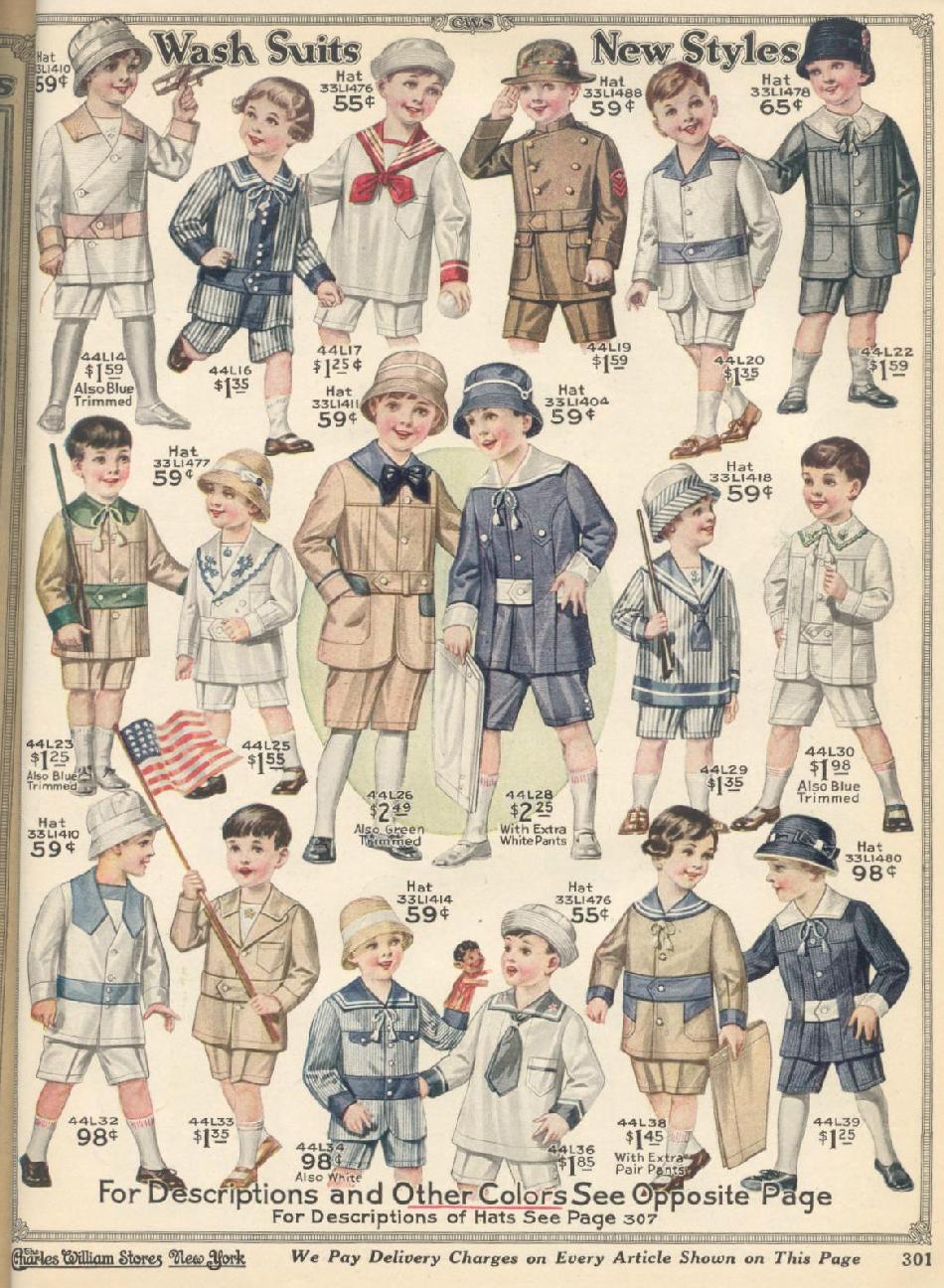 We notice in the 1918 that the Charles Williams store catalog offering a wide range of wash suits for younger boys. Here we see the styles offered (figure 1). We know nothing about this store other than it was in New York. The suits here are for boys 3-8 years old. Some stores offered these or similar suits in pre-school age groups. These suits include sizes for boys in the early primary years, but school portaits show that most boys wanted more mature styles, especially after the first grade. Here we see some of the Williams offerings. Tunic suits were still popular, but notice that the tunics are now being styled more like jackets and are no longer the longer knee-length style we saw in the 1900s and early-10s. Also notice the poularity of Norfolk and Oliver Twist styling. Notice that the pants are straight-leg knee pants beginning a transition to short pants rather than the bloomer knickers we see in the 1900s and early-10s. This is not to say that straight-leg knee pants were exclusively worn at the time, but they were becoming more popular as the style of short pants became increasingly adopted for younger boys. There are matching hats and caps which could be purchsed separately. Although not part of the outfits, the Williams ad has a lot of interesting information about hair styling, hosiery and footwear. And as it is a color advertisement, it provides useful information about color in boys' clothing--something we do not get from themostly black and white images of the day. And of course the ad shows a little pariotic fervor as the country was emersed in World War I. Note one of the boys is wearing two bar closed toe sandals. We did not see any other imagaes of anyone wearing these in the rest of the catalog. Single bar strap shoes appear to have been the most popular style at the time for both boys and girls.