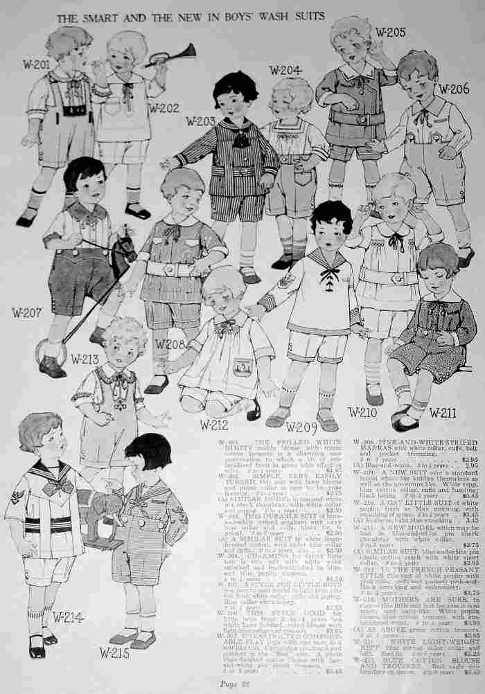 The dresses here are mostly for children 2-4 years of age. Some are done in sizes up to age 6 yeatrs, but most are in the 2-4 years age range. The styles done for slightly older boys were the two sailor suit outfits at the lower left (W-214 and 215) of the page which were done in sizes up to 5-6 years of age (figure 1).