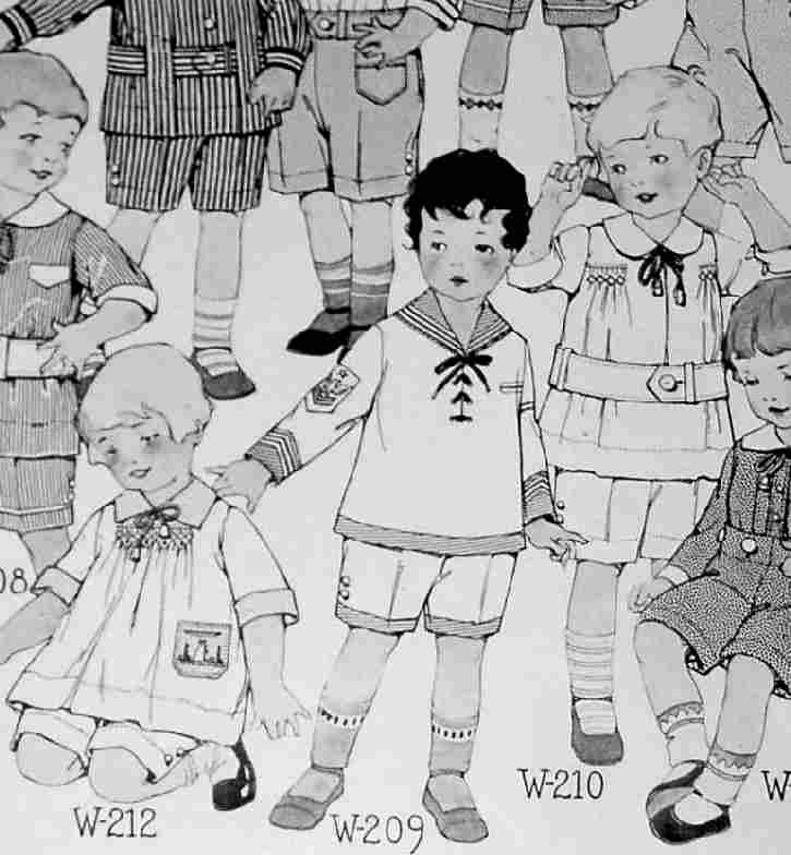 This garment is clkearly a smock. Ameroican boys did not commonly wear smocks, perhaps explaining why Best did not use the term. There are some differences with actual European smocks. One were the hlf sleeves. Smocks were commonly made with long sleeves. The other is the smock here is cit rather short and dies not cover the boy's kneepants. The smocked is detailed with smocking and a patch on pocket. There is a string tie with tassels, anThe smock here is white, but detailed in pink. Despite the fact that American boys did not commonly wear smocks, this outdfit is done in the same sizes as the others. This shows that the modern color conventions were not yet fully estanlished. The Best ad copy read, "IN THE FRENCH PEASANT STYLE this suit of white poplin with pink collar, cuffs and pocket: pink-and-black smocking and embroidery. 2 to 4 years $3.75."