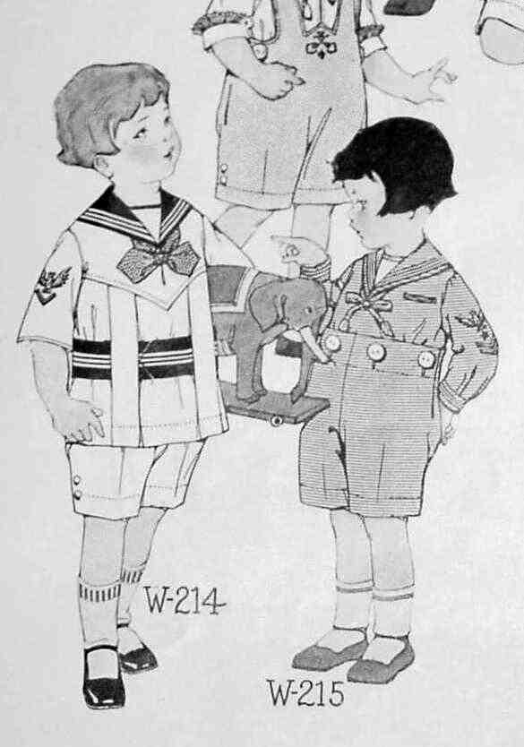 Figure 1.--Best & Co offered a wide range of wash suits for younger boys up to 4 years pf age. We have seen many of these styles made for boys up to age 8 years, but these best suits were mostly for pre-school boys 2-4 years of age. These two sailor suit outfits were done in a slightly larger size than the outfits on the page. We might have guess outfit W-214 would be for an older boy, but it was actually outfit W-215. |