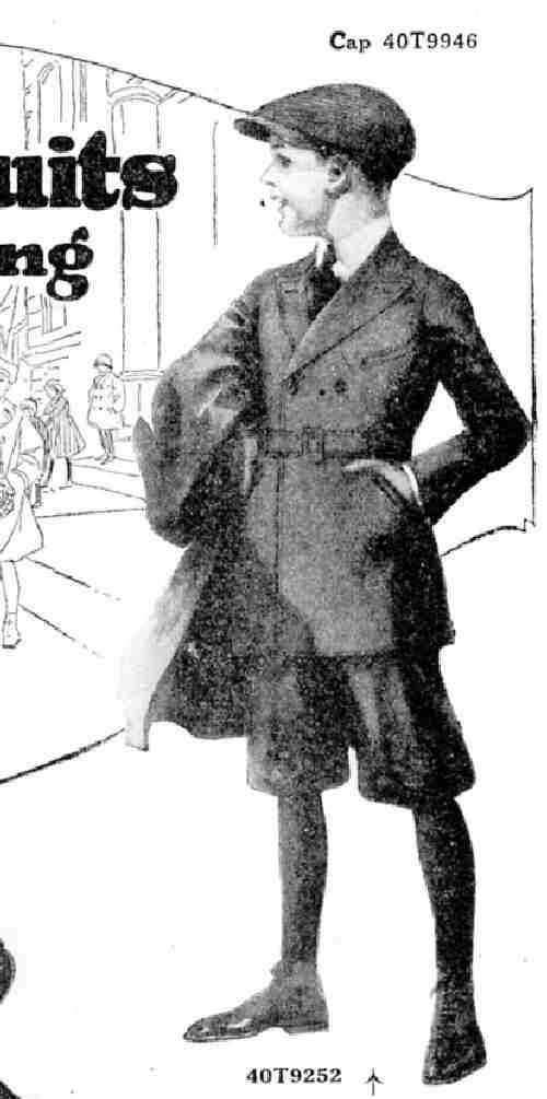 American boys mostly wore knickers in 1919, although kneepants had not completly gone out of style. The catalogs and advertisemenrs we have collected primarily offer knickers. The Sears suit shown here is a good example (figure 1). We note the pants Sears included in their complete back-to-school outfit were knickers, but Sears just refers to them as "pants" and "knickerbockers".