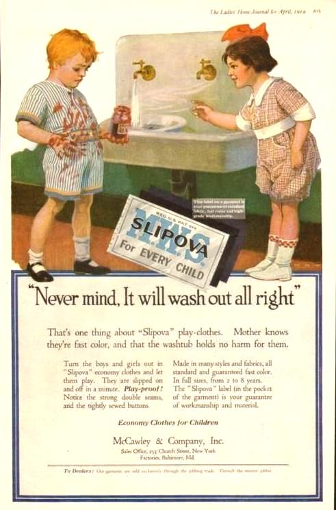 Slipova was a popular brand of easily washed play clothes manufactured McCrawley & Co (figure 1). The company had factories in Baltimore, Maryland. Slipova was a name meaning 'slip over' or easpy to put on. They are captioned, 'Economy Clothes for Children'. As they were play clothes made out of inexpensive cotton fabrics, they were not expensive. The Ladies Home Journal magazine (April 1919) ad here emphasizes the fact that Slipova clothes were easily washed. The garments illustrated are just examples of the product line. The boy wears a one-piece shorts outfit. The girl wears a romper suit. There were other styles for older children. The ad copy read, "'Never mind, It will wash out all right.' That's one thing about 'Slipova' play clothes. Mother knows they're fast color, and that the washtub, holds no harm for them. Turn the boys and girls out in 'Slipova' economy clothes and let them play. They are slipped on and off in a minute. Play-proof! Notice the strong double seams and the tightly sewed bottoms. Made in many styles and favbrics, all stabdard and fast colors.