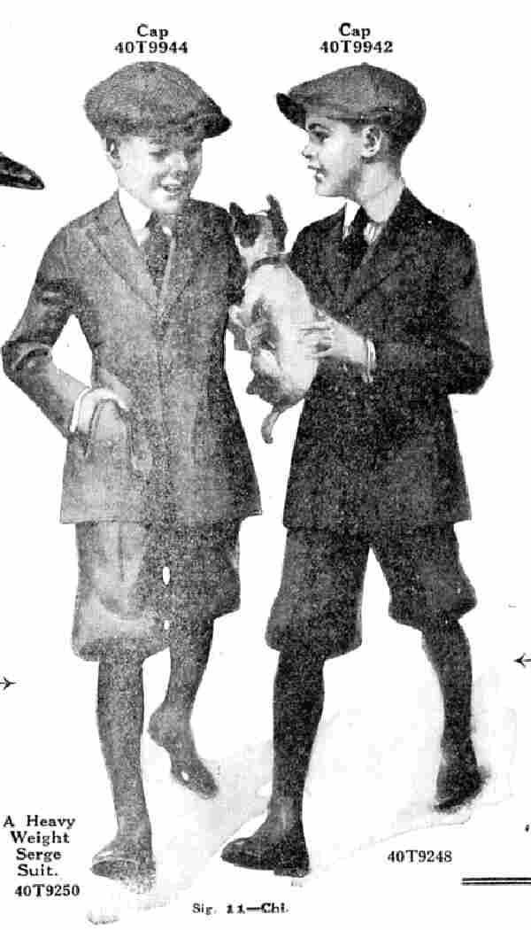 The Sears catalog in 1919 offered a selection of blue serge knickers suits in different styles with matching flat caps. Sears used the term knickerbockers. Blue serge or flannel were especially popular for American boys. They were pictured as being buttoned just below the knee and worn with dark kong stockings. They were suits with different age ranges, but their suits made for boys 6-18 years of age. Some have slight Norfolk styling. Thev boys are all pictured wearing flat caps whivh were called golf caps.