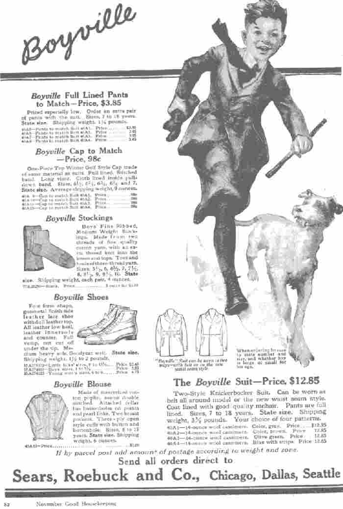 this advertisement is a good index to the standard elements of a schoolboy's dress in 1919. The suit jacket can be worn with or without a belt. There is only one choice of stocking color--black. The shoes are hightop.