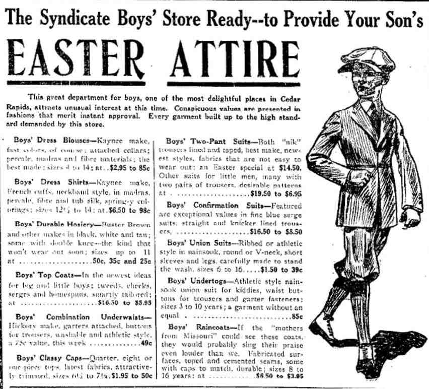 Gazette (April 16, 1919). The ad was placed by the Syndicate Boy's Store. We have no details about the store. It advertises a complete Easter outfit for boys including stockings, waist, underwear, raincoat, dress knickers suit, top coat, and headwear (of course a stylish flat cap). We notice that at the time both stores and mail order catalogs would offer complete outfits like this. The store also offered Confirmation suits. The ad copy read, "The syndicate Boys’ Store Ready—to Provide Your son’s Easter Attire. This great department for boys, one of the most delightful places in Cedar Rapids, attracts unusual interest at this time. Conspicuous values are presented in fashions that merit instant approval. Every garment built up to the high stand demanded by this store."
