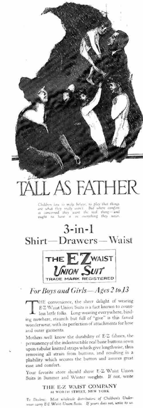 show E-Z Waist Union Suits in Summer and Winter weights. If not, write The E-Z Waist Company, 61 Worth Street, New York. To Dealers: Most wholesale distributors of Children's Underwear carry E-Z Waist Union Suits. If yours does not, write to us."