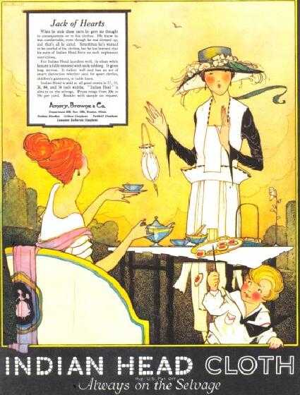 We notice a variety of wash suits done for younger boys. They were done in various styles. We notice both Oliver Twist and sailor suits. They might be worn for both play and dressier occassions. We note Indian Head promoting their fabric, a fine muslim which could be used for boys' outfits as well as girl's and womwn's dresses. A 1919 Indian Head ad depicts a white sailor suit for a younger boy. We are not sure in what magazine the advertisement here appeared. Sailor sits after World War I were becoming a style for yonger boys. Many were dome as play suits. A white suit was more of a dressier outfit. the fabric, Indian Head cloth, was a fine muslim that looked like linen, but was less expensive.