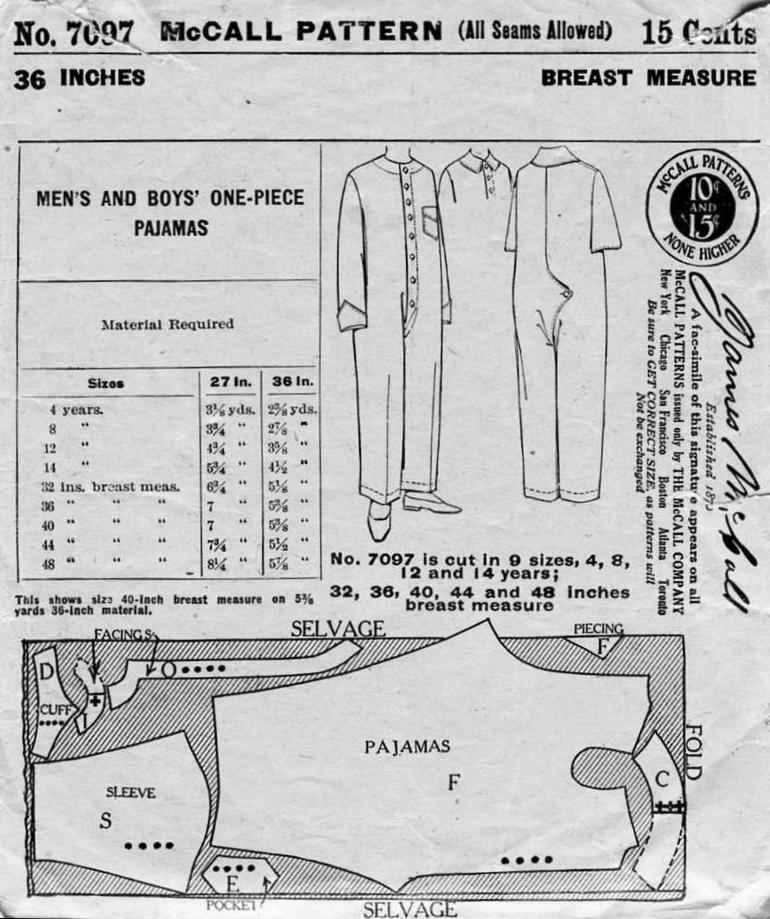 We notice an undated McCalls pattern for men and boys one-piece pajamas. They look rather like the 1920s to us. Perhaps readers will have a better idea about dating the pattern. There are sizes from 4-14 years in unusually lsarge increments, as well as waist sizes for youths and adults. As far as we can tell, they do not seem to have been very popular. We have seen boys weating heavy one-piece footed pajamas, but not pajamas like the pattern here. And we have never noted men wearing them.
