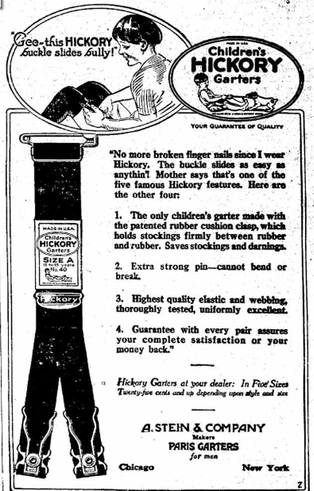 Of all the manufacturers of garter waists and hose supporters during the 1920s in America, the Hickory brand (manufactured by Stein & Company was the best known and most widely advertised. They had offices in both Chicago and New York. Hickory Garters were widely used by American children to hold up their long stockings. Hickory was a national brand name. They were sold all over the country in various stores and were widely advertised in magazines. They advertized extensively in Parents' Magazine. The fact that they were also sold by Sears doesn't rule them out. Stein also made garters for adukts. Their adukt male line was Paris Garters.