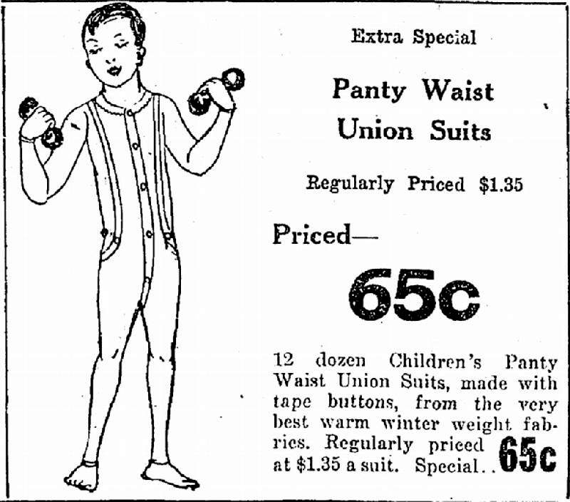 The ad coipy rea, "Extra Special Panty Waist Union Suits, Regularly Priced $1.35, Priced 65 cents. 12 dozen Children's Panty Waist Union Suits, made with tape buttons, from the very best warm winter weight fabrics. Regularly priced at $1.35 a suit. Special 65 cents." The phrase, tape buttons, means that the waist buttons are sewn onto the underwear with tape to make them more flexible and to prevent their being torn off by the tugging of outer clothes fastened to them.