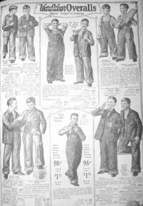 Wards devoted an entire page to overalls which were seen as the page suggests work clothes. They appear to be virtually all bib-front garments. They were often worn with ciffs turned up. The were not seen as casual clothes. They were not to be worn to school, except by less affluent boys in rural areas, and they were only worn by boys. Along with the bib-front overalls were several matching jackets. These overalls were made in many different materials, not just denim and so were the jackets. The jackets were well below waist level, very different from the popular denim jackets of today. Both blue and black denim were available. There were overalls in also khaki cloth. There is also safari drill--I'm not sure what this was. One popular style was stripped drill--often referre to as railroad overalls, but not by Wards. There is one reference to "brownie style," but I'm not sure what that meant. These overall work clothes were made for boys as young as 3 years.
