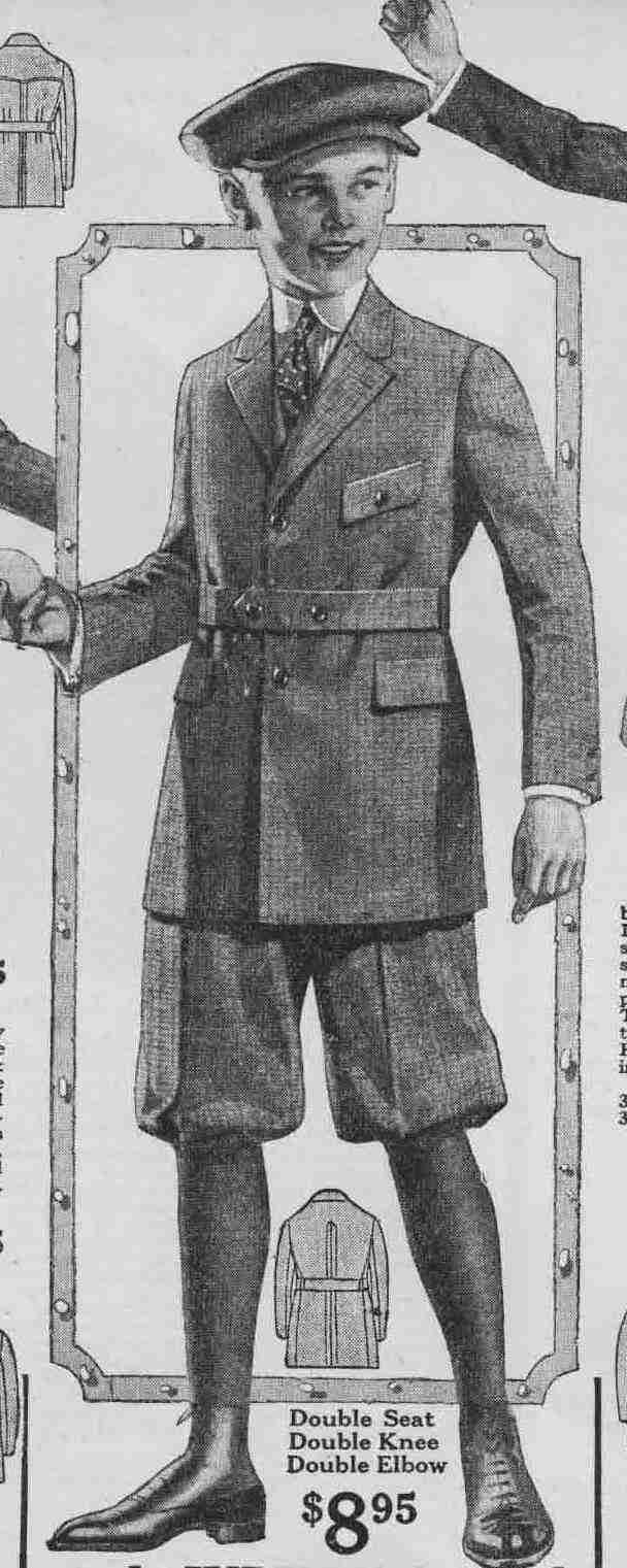 there were "Double Seat, Double Knee, Double Elbow". This suit has a self belt and knickers that fasten just above the knee so that the blousing comes exactly to the knee cap. See the illustration. The ad copy read, "$8.95. 50th Jubilee Special. All wool Brown or Olive Cassimere Or Navy