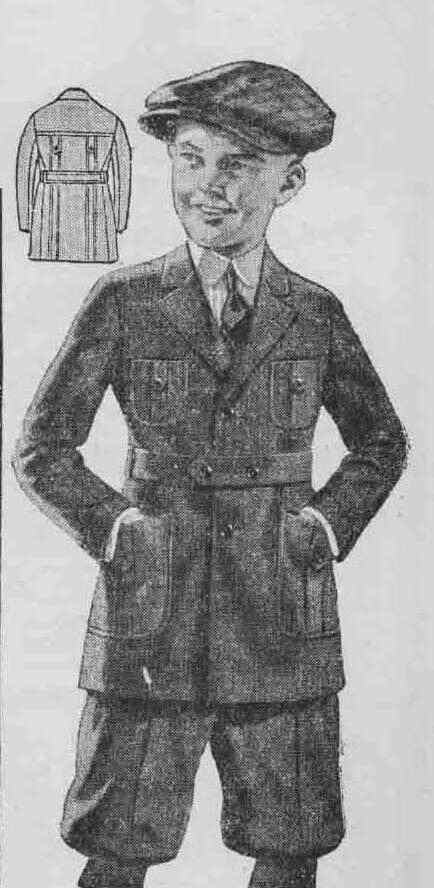 Again the major difference with the other Wards knicker suits was the pockets. The Wards ad copy read, "All Wool Cassimere Brown Stripe $13.50. Sizes 10 to 18 years. Ask your boy what he thinks of this Suit. Snappy model with four fancy patch pockets and "nobby" back. The suit is as good as it looks, too. Full Gibralter serge lined coat with inside breast pocket. Knickers are full lined and have four pockets. Double sewed, taped and serged seat, crotch and inseam. The pattern is exceptionally neat in a shade of dark brown with indistinct dark stripes having very faint silk decorations. Your boy may not appreciate the good workmanship, but he will recognise and appreciate the individual style. State size wanted. 39 C 3373--Dark Brown. Price, %13.50. Postage, 10 cents extra." I'm not sure what Gibralter sege was. I don't think Gibraltar was particularly noted for textiles. It was a small British outpost at the tip of Spain.