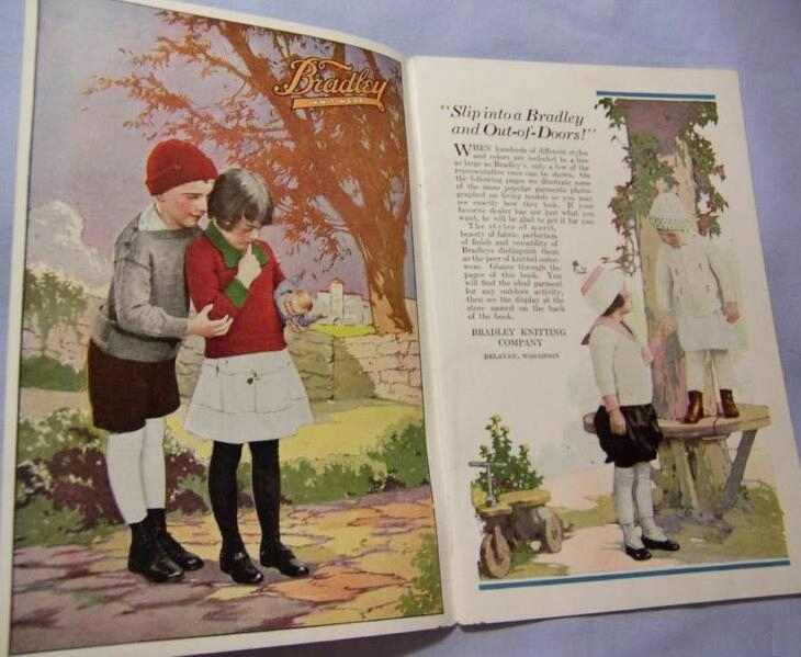 Sweaters were very popular in the 1920s. Children commonly wore them to school and to play in during cool weather. We nore a catlog published by the Bradley Knitting Company. The company manufactured a wide range of sweaters and other cold-weather wear. Thev Bradley Knitting Company was founded in Delavan, Wisconsin (1904). It was a major manufacturing facility, and the pricipasl employerin Delevan. At the cpmpany' peak, 1,200 people were emploted by the company. Bradley made a wide range of knitted garments. Tosay we think of knits as sweaters and other cold weather clothing. Bradley is best remembered for their knit wool bathing suits. The company focused on sportswear, and their slogan in the early years was "Slip into a Bradley and Out-of-doors."