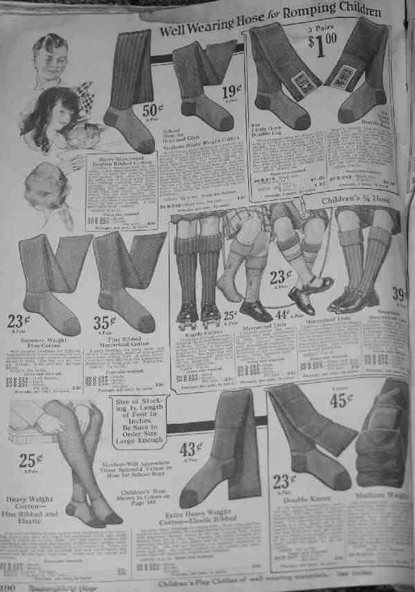 A 1923 Wards mail order catalog shows the varied styles of hosiery available for boys and girls in 1923. The page from the summer catalog was entiled, "Well wearing hose for roming children". The illustrations show boys wearing both kneesocks and long stockings with anove the knee knickers. Wearing kneesocks with above the knee knickers was only in fashion for a few years. Much but not all of the hosiery offered for sale was the same for both boys and girls.