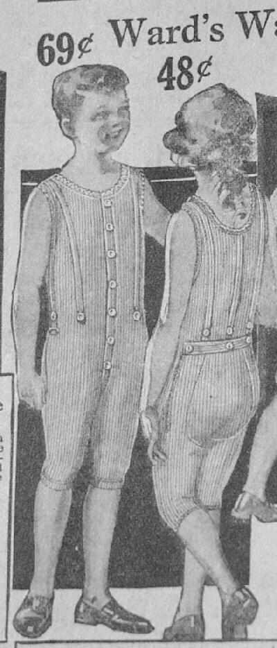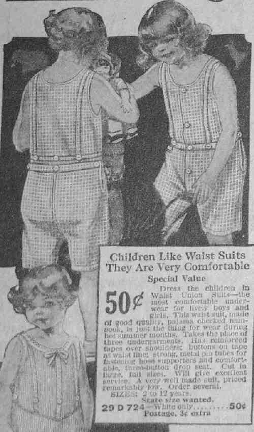 I am not entirely sujre what the different names for children;s underwear meant. There were several styles of combination suits. They were called combination sits because they combined both underm shirts and under pants. Wards also calls them "waist suits", "union suits", and "romper togs". The waist suit I think referred to the waist with buttons that could be used to hold up pants and and long stockings. A union suit is essentially the same as a combination suit that covered both the upper and lower torso. It was a male garment, although they were also made for girls through the early teen years. Like the combination suits, the suits were called union suits because the top and bottom were joined or united into a one-piece garment. The children;s versions were even more of a unioin or combination suit in that they also provided for support for holding up long stockings. The original union suits were made with ankle length legs and long sleeves. Later they were made in knee lengths for children who were sometimes not wearing long stockings. They also began to be made without sleeves. These suits normally down the front. A drop seat was added in the latter 19th century. These suits were available in a wide range of crotch closure for both convenience and hygiene in the early 20th century. The romper togs for girls and very young boys referred to the pants part of the garment which balooned out like rompers.