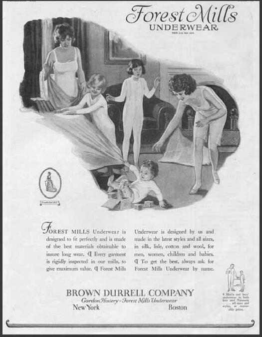 Here we see an ad for Forest Mills Underwear. The ad emphasizes the company's product line for the entire family. I'm not sure what magazine carried the advertisement. We do know that it appeared in 1923. Forest Mills was a brand name for the Brown Durrel Company. This is not a company which we know anything about at this time. Notice that in the illustration here that at least one of the union suits is a "waist union suit." You can just make out the reinforcement straps over