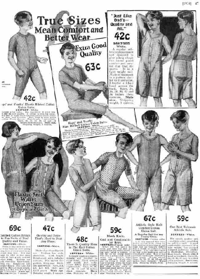 The Sears ad copy read, "57 cents. Athletic Style Knit Combed Cotton Union Suit. A regular Suit for any Young Chap. 16R7528--Cream color. It is only natural that every thrifty person looks about before making a purchase of any kind, but we honestly believe that it would be useless in this instance. This suit offers quality that is the making of such a remarkable value. Knit of fine combed cotton yarn. Sleeveless, knee length. Elastic ribbed. Sizes, 24, 26, 28, 30, 32 and 34 inches chest measure. State size. Shipping weight, 6 oz."