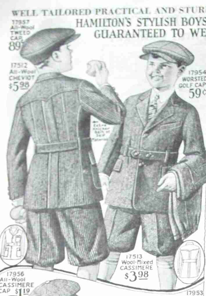 Sears offered a page with several different styles of knicker suits in corduroy and other materials. Norfolk styling was still evident. They came with extra pants. Long stockings were still quite common.