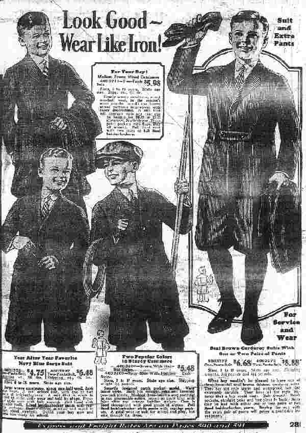 At the top left Sears offered "For Your Boy! 40 D 3211--Two Pants Suit $5.98. Sizes, 5 to 15 years. State age size, Shpg wt. 4 1/2 lbs. Firmly woven cassimere, about one-half wool, in the season's most popular medium brown mixed patterns interwoven with fancy decorations. A suit that will compare with any that can be bought for $8.00 or $9.00 elsewhere. Stylishly cut. Three patch pockets with flaps. Belt all around. Full lined coat with two pairs of full lined knickerbockers."