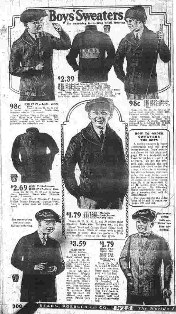 "How to Order Sweaters for Boys: A roomy sweater is more comfrotable and will give better service. boys' sweaters shown on this page and page 309 are designed and made to fit boys from 5 to 13 years. To get the correct size, measure the boy around his chest under the armpits when he is wearing his shirt or blouse, and then order the next larger size; for instance if he measures 22 inches or 23 inches, order size 24; if he measures 30 or 31 inches, order size 32 and so on. By following these instructions, you will get a sweater that will fit comfortably. For sweaters for the older boys of 14 and 16 years see pages 310 and 311." [Note: Taking the chest measurement was a common way of measuring for boys' clothes such as suit jackets. Chest measurements were also used sometimes for boys' underwear, although the measurement in inches from shoulder to crotch was the typical way of measuring for boys' knitted union suits.]