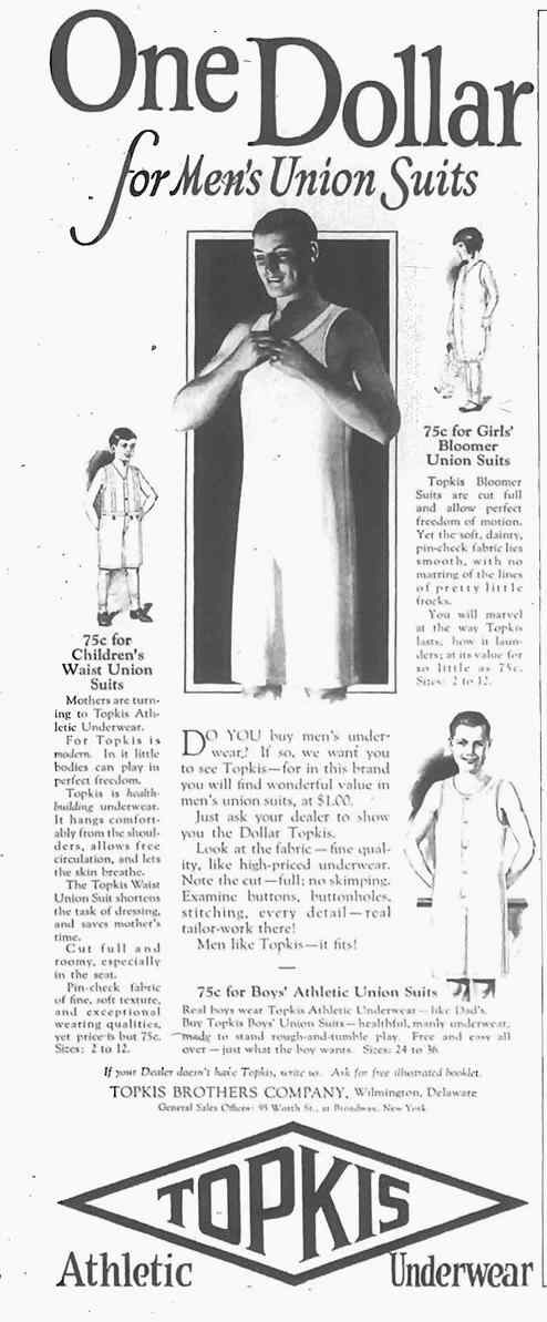 This ad offered summer underwear ad for fathers, sons, and daughters. The manufacturer is Topkis Athletic Underwear. All the models are sleeveless summer union suits made of light fabric similar to nainsook. There are four models shown: 1. boys' or girls' waist union suits; 2. Men's union suits; 3. girls' bloomer union suits; and 4. boys' untaped athletic union suits. The ad appeared in the Ladies Home Journal for May 1925, page 72. The Topkis Brothers company was located in Wilmington, Delaware, with a general sales office at 95 Worth St. at Broadway, New York City.