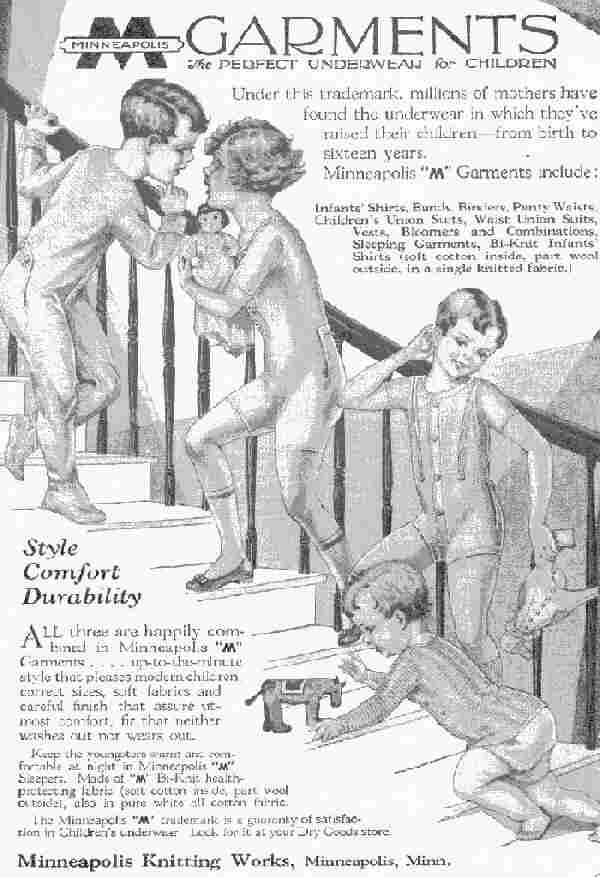 drop seat; 3) a boy's or girl's trunk-length waist union suit with sleeveless top. This has strap reinforcements over the shoulders, and waist buttons at front, back, and sides, also metal pinning tubes at the sides for attaching hose supporters and a drop seat; 4) an infants' long-sleeve undershirt. The ad copy reads: "Minneapolis Garments: The Perfect Underwear for Children. Under this trademark, millions of mothers have found the underwear in which they've raised their children--from birth to sixteen years. Minneapolis "M" Garment include: Infants' Shirts, Bands, Binders, Panty Waists; Children's Union Suits, Waist Union Suits, Sleeping Garments, Bi-Knit Infants Shirts (soft cotton inside, part wool outside, in a single knitted fabric.) [HBC Note: