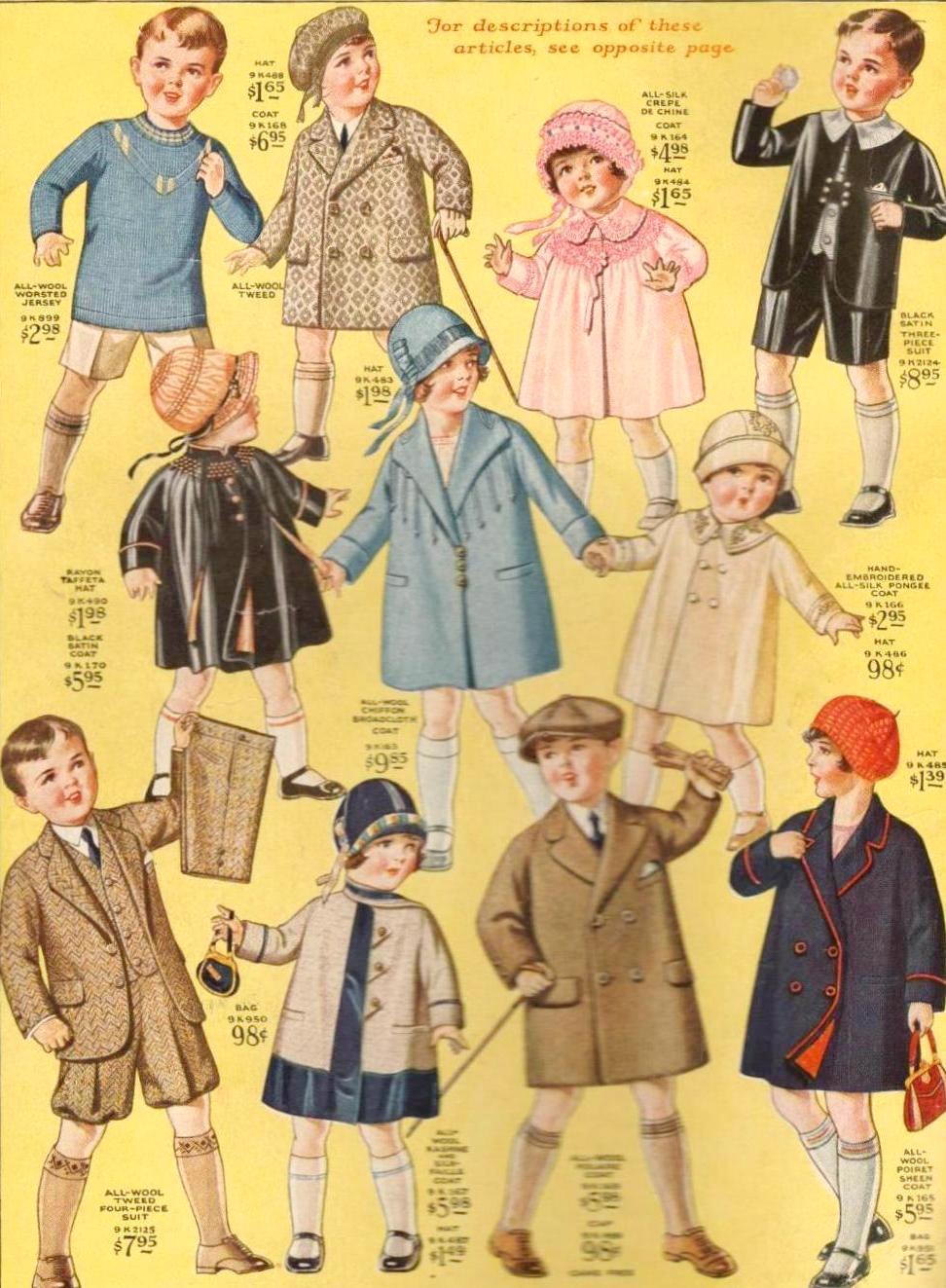 Lane Bryant was an important chain store and catalog company in the 1920s. The line was much more limited than the major catalog companies with a focus on ladies and younger children. The more modern focus on stout ladies is a more recent product line. Here we have a range of garments the company offered for the 3-8 year age group for Spring-Summer wear. There is no heading. The seasonslity explains why socks are pictured rather than long stockings. The boys are pictured wearing a varity of short pants, knee pants, and knickers. Only some of the items are pictured on the illustration page. There seem to be a lot of coats fora Spring-Summer catalog,