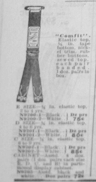 The ad copy read, "'Comfit', Elastic top 5/8 in. tape bottom, nickel trim, rubber buttons, sewed top, each pair banded. 1 doz. pairs in box." There were three sizes, each available in black or white. E Size -- 3/8 in. elastic top, 2 to 4 yrs. The dozen pairs were 75c. D Size was 1/2 in. elastic top for children 4 to 6 yrs. A dozen pair were 80c. C Size had a 5/8 in. elastic top, 6 to 9 yrs. A dozen pairs were 85c. A merchant could buy a cabinent with an assortment of these stocking supporters. It included 4 dozen pair (1 doz. pairs each size (E. D, C, and B) in partioned display cabinent. ???265--Assorted black and white ... Doz pairs 72c." We are not sure why the size B is not expained in the ad copy or for that matter what happened to size A.