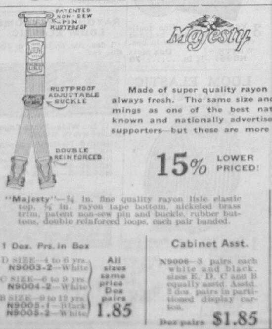 The ad copy read, "Made of super quality rayon elastic, always fresh. The same size and trimmings as one of the best nationally known and nationally adverised hose supporters--but these are more than 15% lower priced. 'Majesty'--7/8 in. fine quality rayon lisle elastic top, 5/8 in. rayon tape bottom, nickeled brass trim, patent non-sew pin and buckle, rubber buttons, double reinforced loops, each pair banded. 1 doz. prs. in box. D Size--4 to 6 yes. N9003-2--White. C Size--6 to 9 yrs. N9004-2--White. B Size--9 to 12 yrs. N9005-1--Black N9005-2--White. All sizes same price Doz pairs 1.85. Cabinent asst. N9006--3 pairs each white and black, sizes E, D, C, and B equally asstd. Asstd 2 doz. pairs in partioned display carton. Doz pairs $1.85 (figure 2)." There was also a display stand available to interested merchants. The ad copy read, "Attactive black japanned metal display stand, woth 75c FREE with each asst. N9007--Display stand asst., sizes E, D, C, and B, equally asstd. 1 doz. pairs black 1 doz. pairs white with fancy colored stripes. Asstd 3 doz. pairs with black japanned metal display stand in shipping carton. Doz. pairs $1.85 (figure 3)."