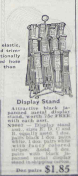 Butler Brothers also offered Hickory stocking supporters. The ad copy read, "'Hickory' Heavy super lisle elastic top, 5/8 in. tape bottom, nickeled brass trim, patent non-sew pin and buvckkle, rubber buttons, double reinforced loops, each pair banded." Then below the ad copy read, "1 Doz, Prs. in Box. E Size--2/4 in. elastic top, 2 to 4 yrs. N40-E2--White Dz prs $1,90. D Size--3/4 in elastic top, 4 to 6 yrs N40-D2--White Dz prs $2.05. C Size--7/8 in. elastic top, 6 to 9 yrs. N40-C2--White Dz prs $2.15. Cabinent--Asstd. 2 doz. p;airs (1/2 doz. pairs size E, D. C, and B) in cabinent. N40-2W--White Dz prs $2.05." There was also an assortment on a stand. The ad copy read, 'Assortment' N6006--Merry-go-round cabinent and 4 sizes Asstd. as follows: Sizes B and E 1/2 doz black and 1/2 doz. white. Sizes C and D 1 doz black and 1 doz. white. Asstd. 6 doz. on revolving stand with ??? metal top in shipping container. Doz. $2.20. The Hickory stocking supporter illustrations are not shown here, but can be seen on the Butler Brothers page. Note the size distribution here, this suggests that these stocking supporters and perhaps long stockings, were most popular for ages 4-9 years.