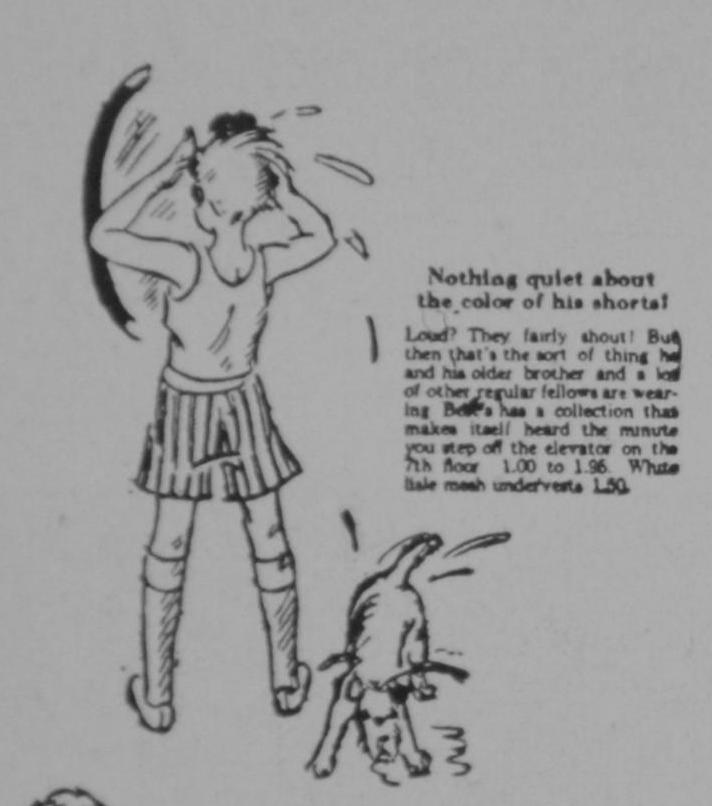 We note a transition in underwear styles going on during 1928. We see some well-established items. We also notice waist union suits, combining support garmnts anf the union suit, a major underwear garment fot dcades. We also notice more modern-looking garments like vests (singlets and coloful boxer shorts. Best offered colorful striped boxer shorts which were worn with white vests (figure 1). I recall my dad calld these undersirts 'vests' The modern term seems to be singlet. As far as we know, this was the beginning of strioed boxers which became very common.