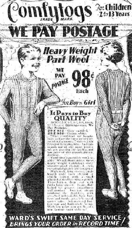 The Watd's ad copy read, "Comfytogs (Trade Mark) For Children 2 to 13 Years. We Pay Postage. Heavy Weight Part Wool. 98 c. Each. For Boy or Girl. It Pays to Buy Quality. Ages: 2-3, 4-5, 6-7, 8-9, 10-11, 12-13 years. State age-size. We Pay Postage.